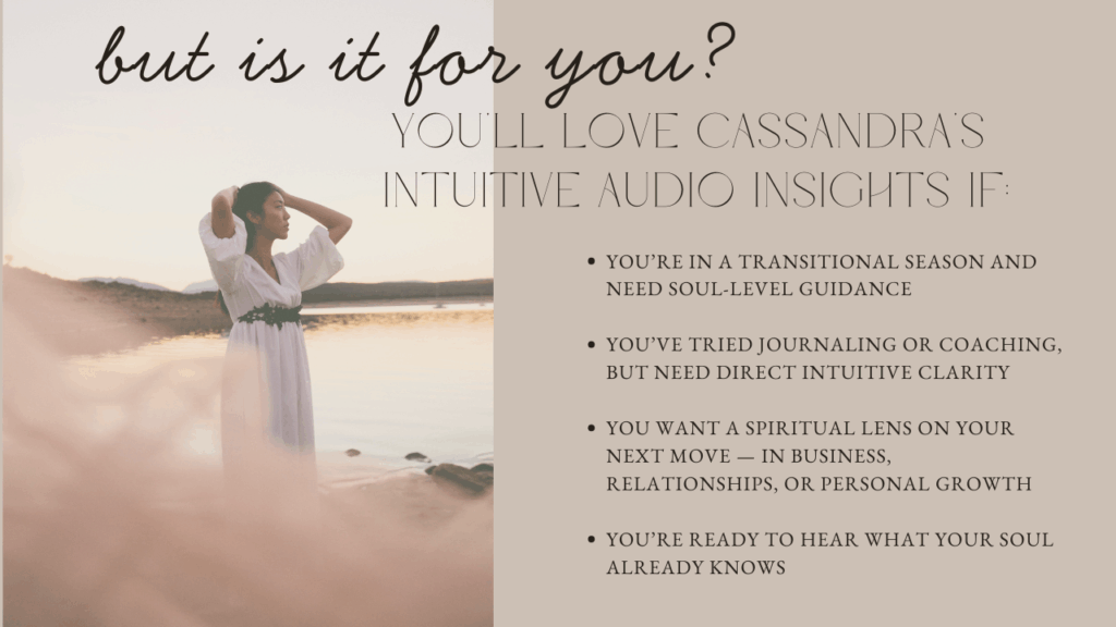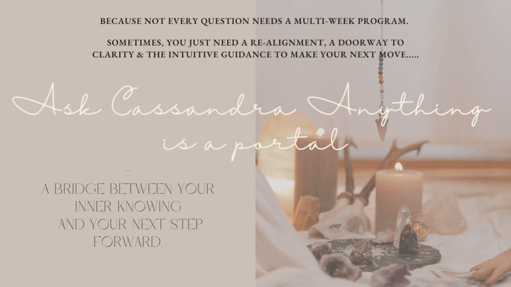 Enter Ask Cassandra Anything: a deeply intuitive offering where you voice your question, share your context, and receive a lovingly crafted audio reply — complete with an oracle card pull — revealing what your soul is trying to show you next and giving you guidance to take the practical actions as well as embody the energetic alignment needed.