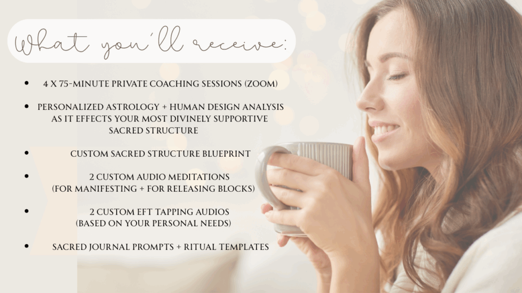Over 8 weeks, you and I will work one-on-one to create a Sacred Structure that’s fully customized to your life, energy, and season. This is high-touch, heart-led guidance designed for deep transformation, not surface-level structure.